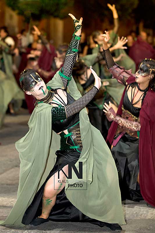 Zu den Höhepunkten im Jahresablauf in Spanien zählen bei den Fiestas die spektakulären Umzüge, Auftritte, Veranstaltungen der Moros y Cristianos wie hier in Almoradi, in der Vega Baja, in der Provinz Alicante, Comunitat Valenciana.